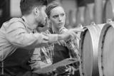 a woman and man working with wine