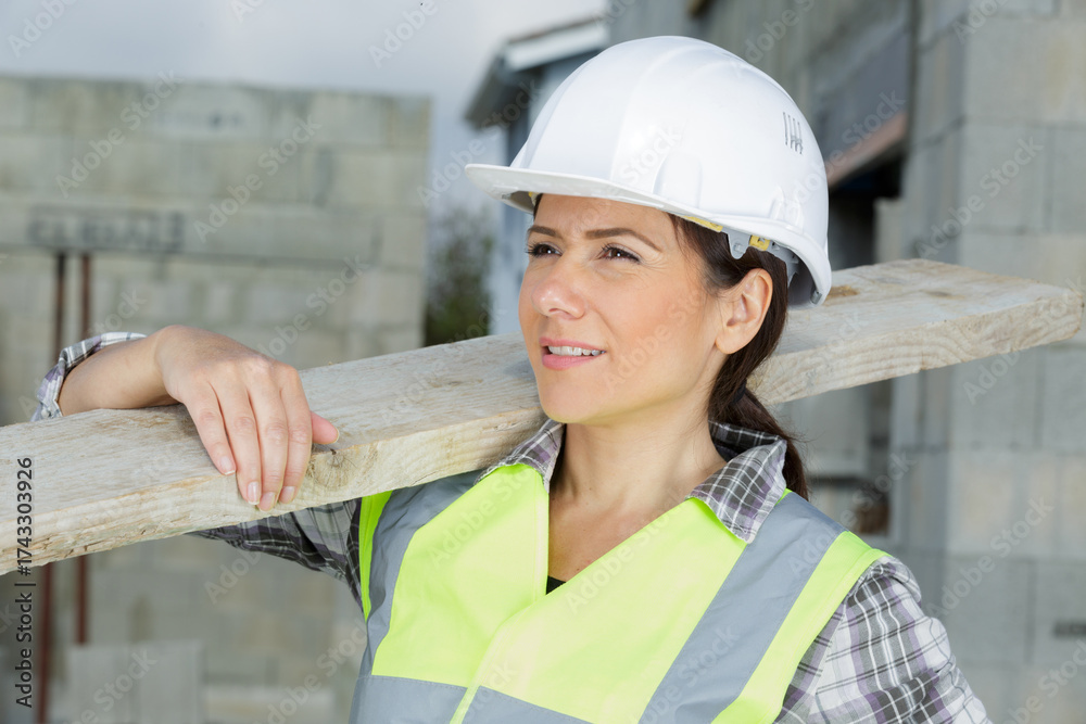 builder female apprentice carrying wood on site