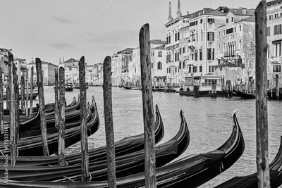 Gondolas deployed in a canal in Venice, Italy, black and white photos.