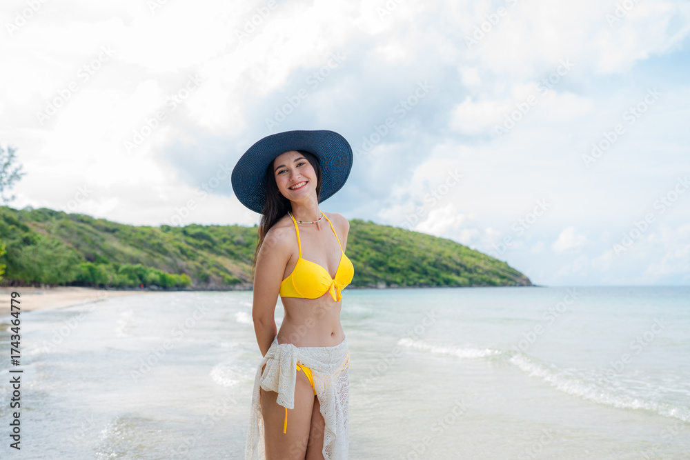 Beautiful caucasian woman in white bikini on tropical beach. Portrait of dark skinned woman smiling at sea. Brunette tanned girl in swimwear enjoying and walking on beach.