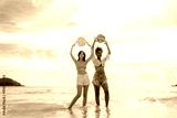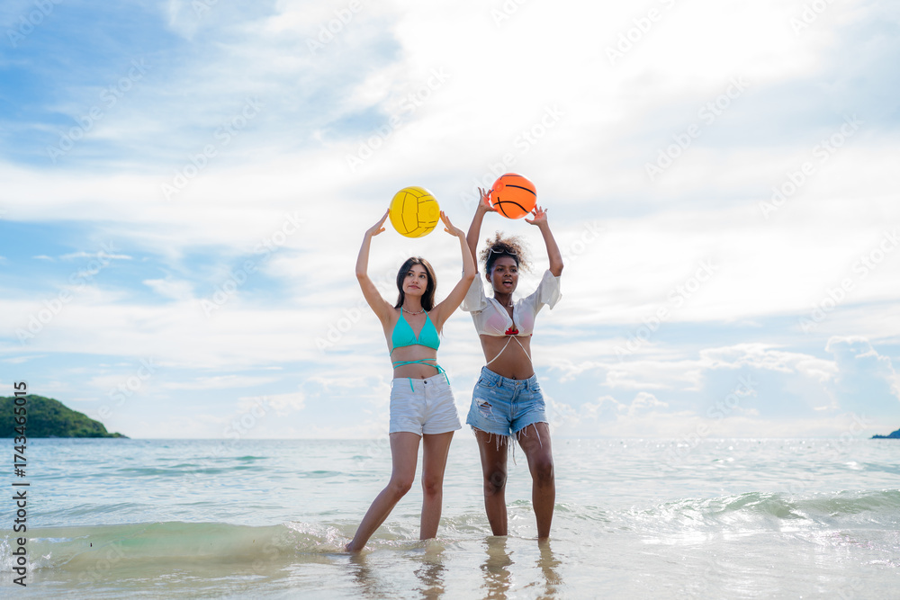 Happy beauty woman in bikini walking and playing together on the beach having fun in a sunny day, Beach summer holiday sea people concept.