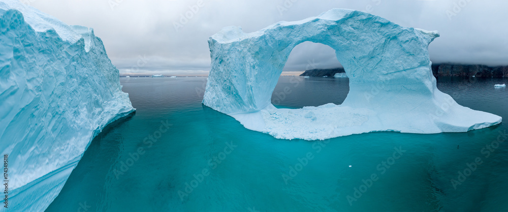 defaultHuge icebergs floating in the sea in a fjord off the coast of Greenland. Floating icebergs, global warming, and climate change. Aerial view of the ice. Summer time, popular tourist destination.