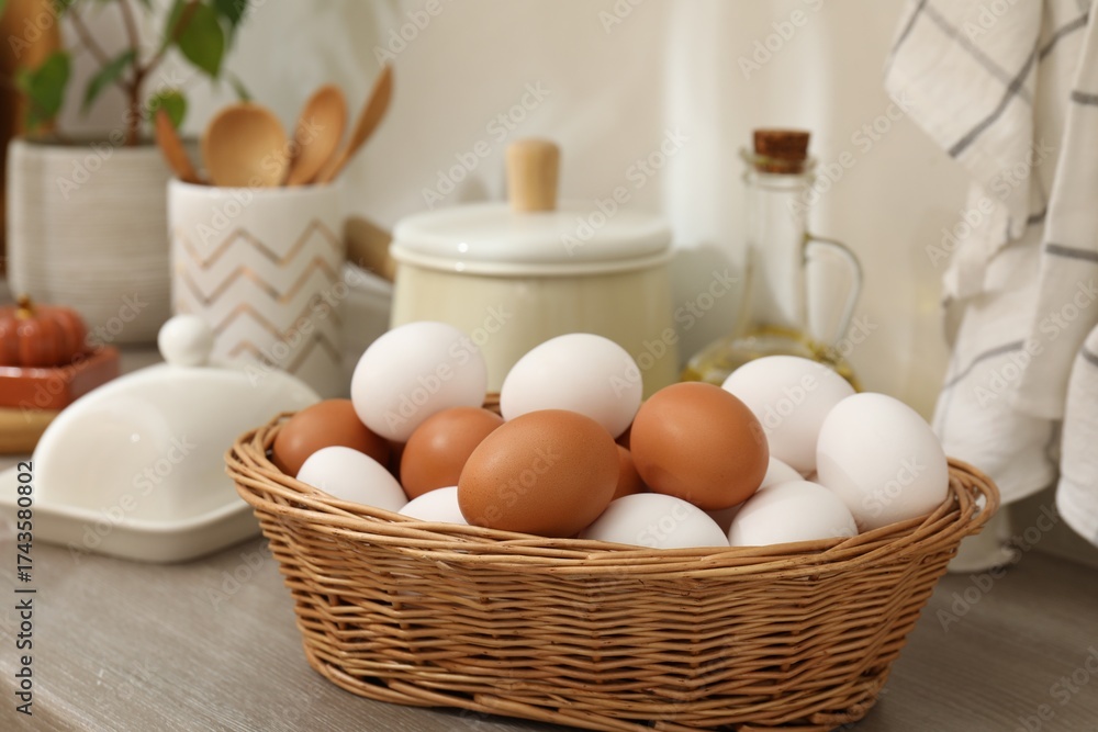 Raw chicken eggs in wicker basket on wooden counter indoors, closeup
