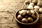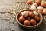 Raw chicken eggs in bowl and straw on wooden table, closeup. Space for text