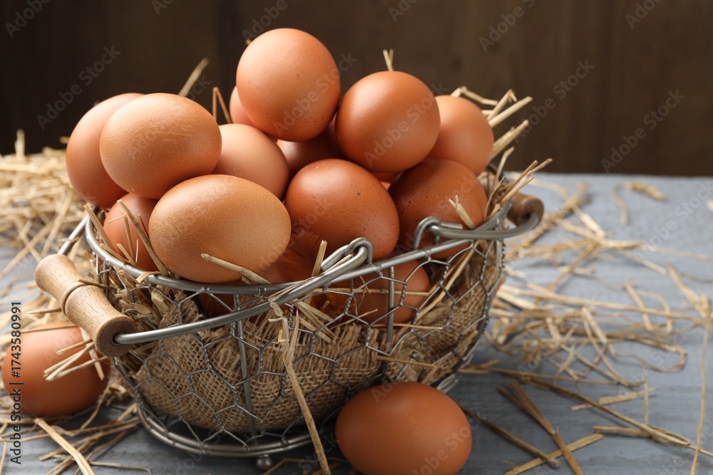 Raw chicken eggs, metal basket and straw on grey wooden table against brown background, closeup