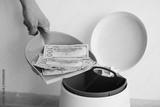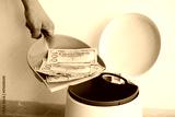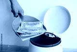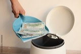 Man throwing dollar banknotes from dustpan into trash bin indoors, closeup