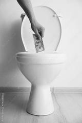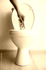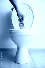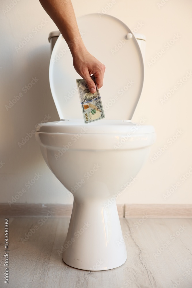 Man throwing dollar banknote into toilet bowl indoors, closeup