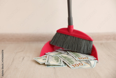 Dustpan with dollar banknotes and broom indoors, closeup. Space for text