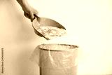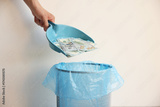Man throwing dollar banknotes from dustpan into trash bin on white background, closeup