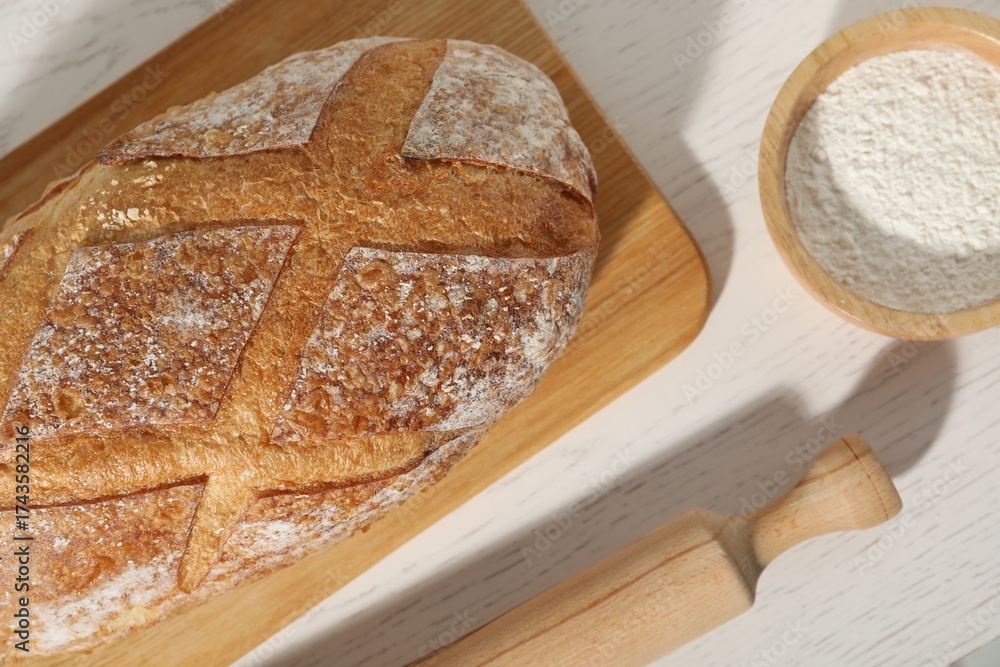 Loaf of fresh bread, flour and rolling pin on white wooden table, flat lay