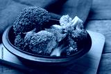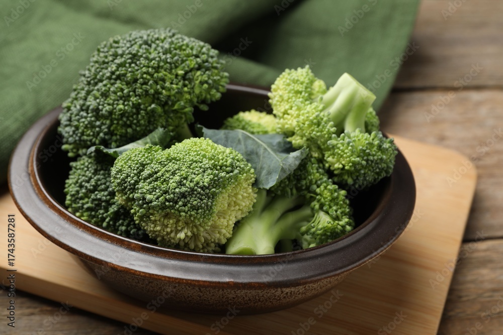 Fresh broccoli florets in bowl on wooden table, closeup