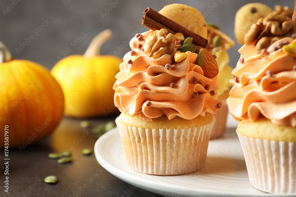 Delicious cupcakes with color cream, cinnamon, nuts and autumn decor on grey table, closeup
