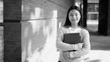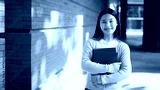 A young woman wearing a yellow sweater and black pants is holding a blue book. She is smiling and she is happy