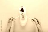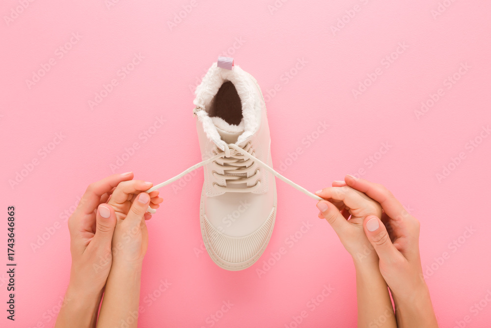 Mother and little child girl hands together tying shoelaces of white warm winter boots on pink table background. Pastel color. Closeup. Learning to tie shoelaces. Point of view shot. Top down view.