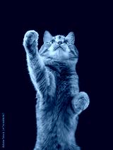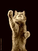 A ginger cat extends one paw while sitting up tall. Its eyes are wide and focused with one paw suspended.