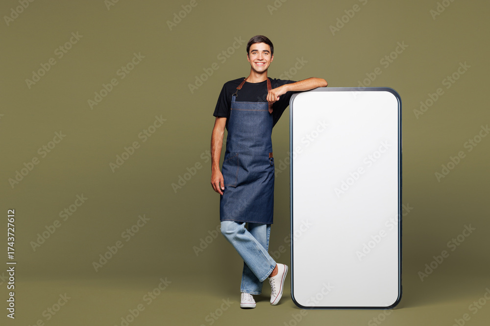 Full body young man barista bartender barman wears apron t-shirt work in coffee shop stand big huge blank screen mobile cell phone isolated on plain green background. Small business startup concept