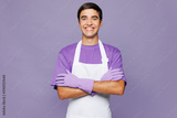 Young smiling happy man wearing violet t-shirt apron while doing housework tidy up hold hands crossed folded look camera isolated on plain pastel light purple background studio. Housekeeping concept.