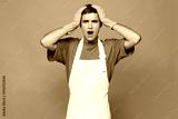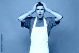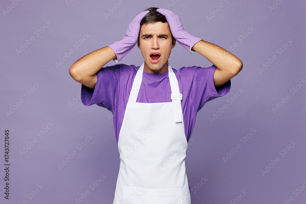 Young shocked scared astonished surprised man wear violet t-shirt apron while doing housework tidy up put hands on head isolated on plain pastel light purple background studio. Housekeeping concept.