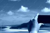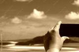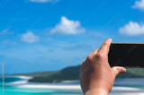 Tourist taking photo of tropical beach with his or her smartphone