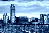 Railway Station in modern district Copenhagen with glass skyscrapers, Denmark.