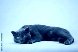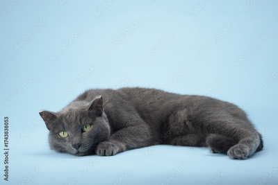 The cat is seen lying on its side in a peaceful and comfortable position. Its expression remains neutral, with one ear slightly twitching.
