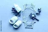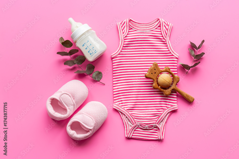 Baby bodysuits and eco friendly accessories - booties, wooden rattle toy and baby bottle with milk on pink background, top view