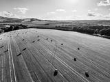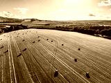 Straw bales in the Scottish fields from a drone, Southeast Scotland, UK