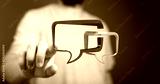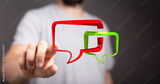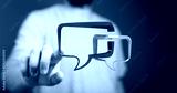 Concept of online communication depicted by a finger tapping speech bubble symbols on a digital interface, emphasizing connectivity.