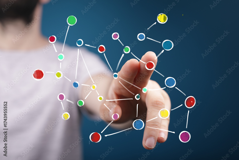 Abstract image of a hand interacting with a vibrant network, ideal for technology, connection, and innovation concepts.