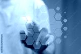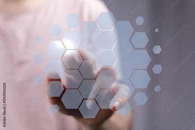 Abstract image of a hand interacting with a digital interface composed of hexagons. Modern technology concept.