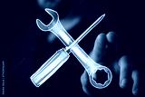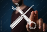 Hand pointing at digital tools. Repair, maintenance, solution, technology concept.