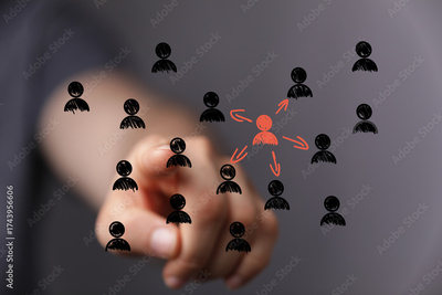 Hand points to central figure in network. Ideal for leadership, teamwork, and human resources concepts.