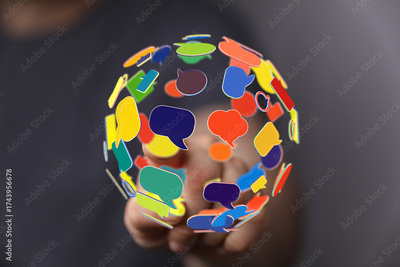 A person holds a globe of colorful speech bubbles, illustrating connection and communication in a global network.