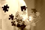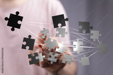 Person's hand assembling puzzle pieces, representing teamwork, problem-solving, and interconnectedness, emphasizing connection and collaboration