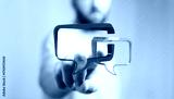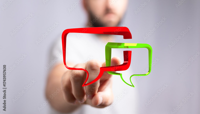 Person pointing at red and green speech bubbles to represent communication and discussion, ideal for business and social media themes.