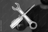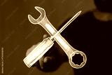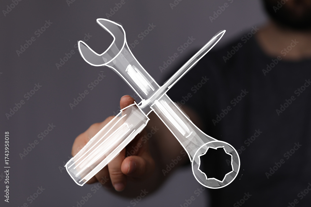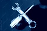 Hand holding digital wrench and screwdriver. Repair, maintenance, service concept.