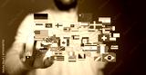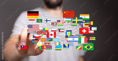 A concept image showing a person connecting various national flags, representing global connection, international relations, and the interconnec