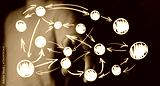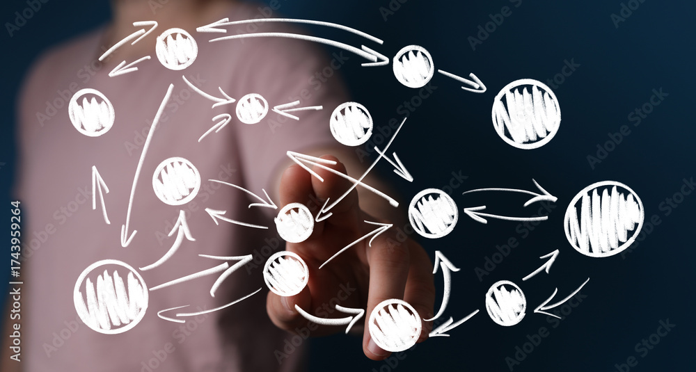 Hand interacting with a virtual network representing business strategy, workflow, data flow, and modern communication. Ideal for concepts of con