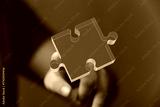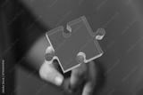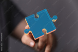 Person holding a single blue jigsaw puzzle piece, teamwork and cooperation, solutions, problem solving, conceptual design, collaboration, and un