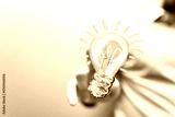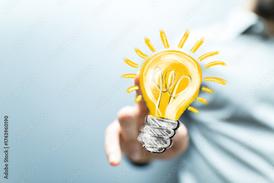 Illustration of hand touching an illustrated light bulb, representing idea, innovation, creative thinking, and business solution.