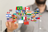 An image depicting a hand interacting with flags from around the world. Concepts of global diversity, travel, and unity.