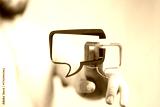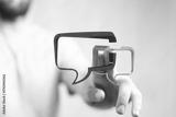 Online communications concept featuring a hand touching digital speech bubbles, modern connection, and virtual networking.