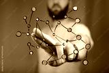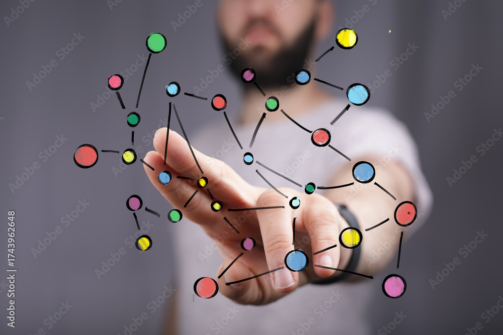 Abstract image of a person interacting with a colorful network, representing connection, technology, and communication.