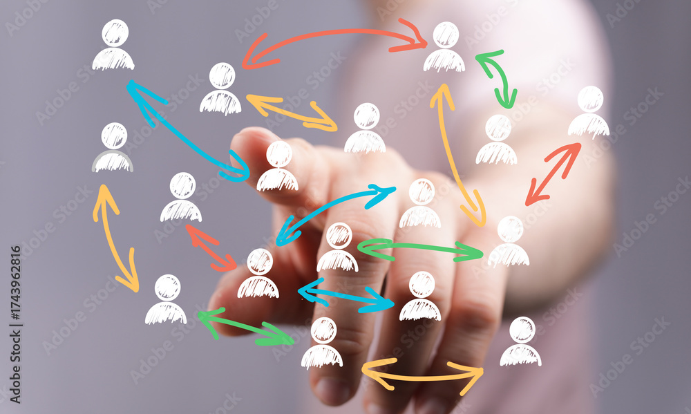Hand interacting with network diagram. Illustrates connections, communication, teamwork, and collaboration.