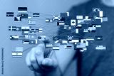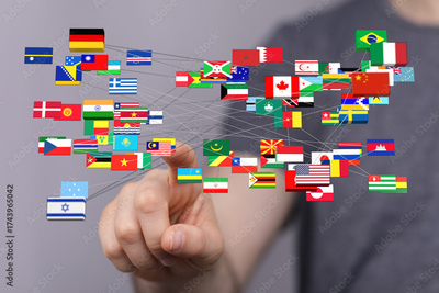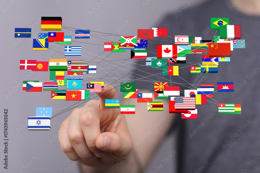 A digital hand interacting with world flags, representing global connection and international relations. Perfect for concepts of globalization,