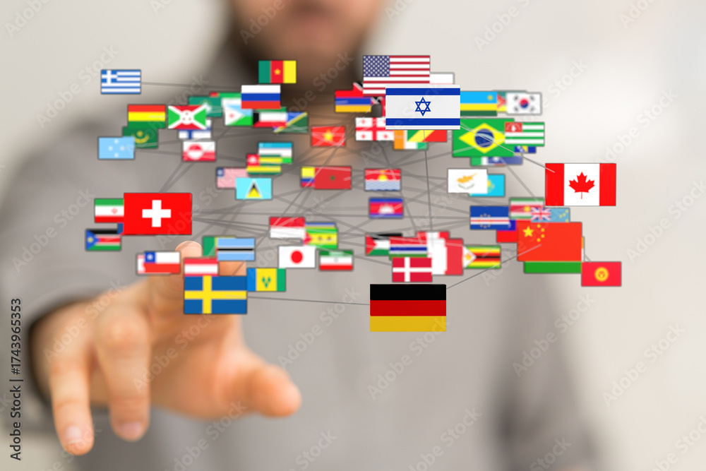 A person touching connected flags representing international relations, global unity, and worldwide communication. Concepts include globalizatio
