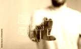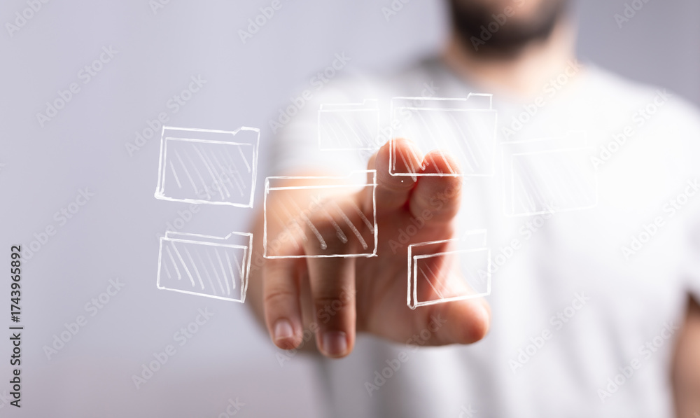 A man interacting with a virtual interface, selecting from digital folders, representing data management, file organization, and technology.