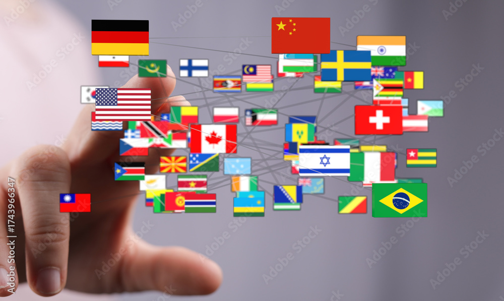A hand interacting with a network of international flags, symbolizing globalization, connection and global community. The image is ideal for con