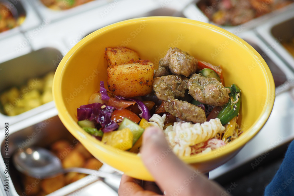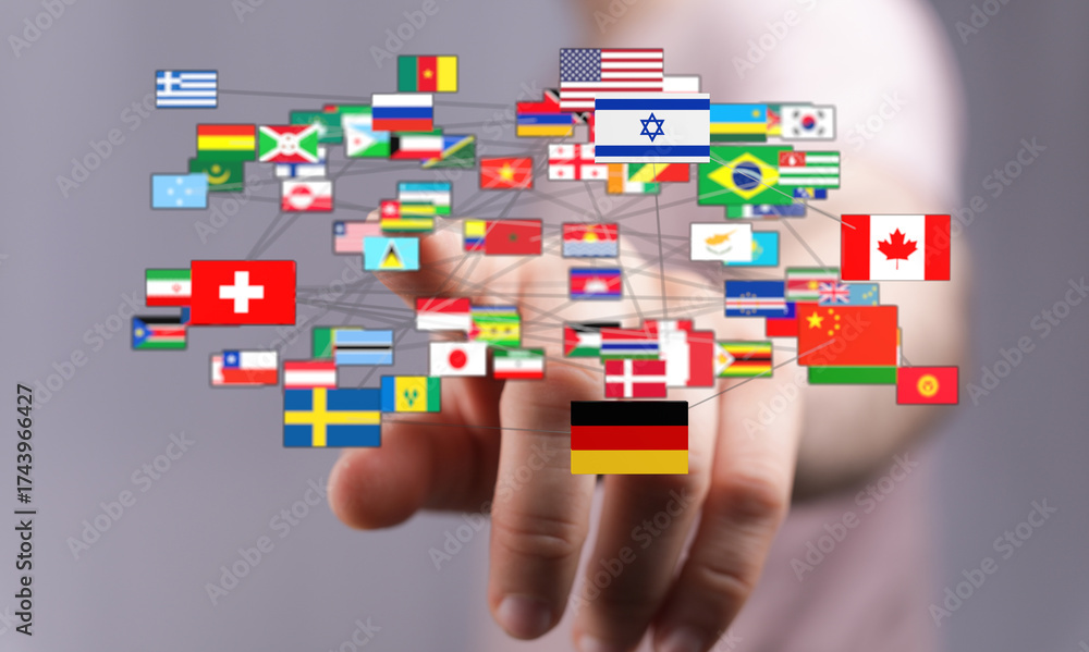 Visual representation of global connectivity, featuring a hand connecting flags of the world. Concept of globalization, international cooperatio