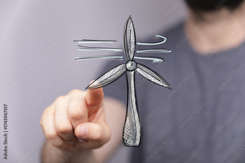 Close-up of a hand interacting with a wind turbine drawing, symbolizing renewable energy and sustainability.